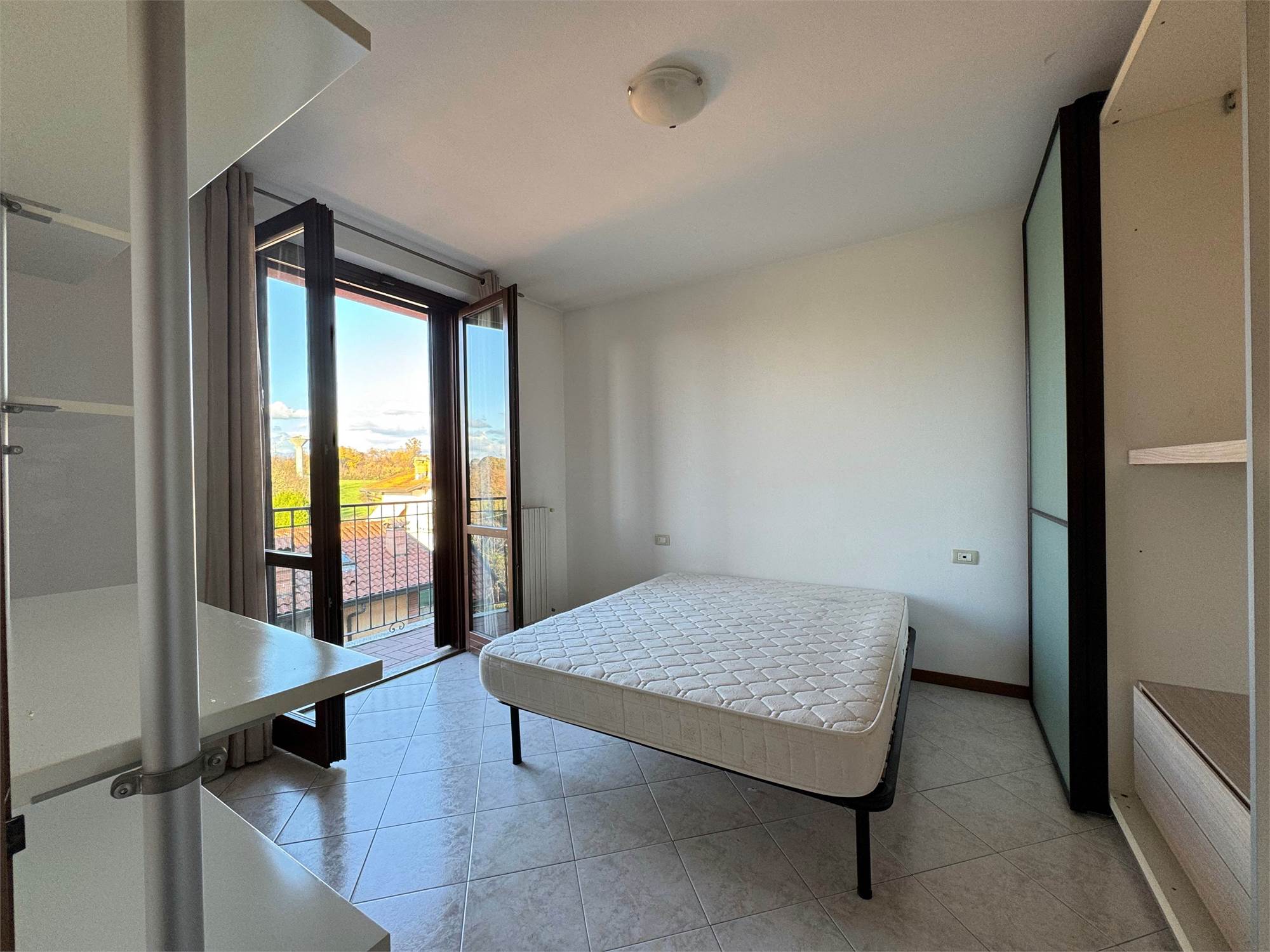 Entrando, troviamo una luminosa zona giorno con ampia portafinestra su ballatoio, con cucina ad angolo a vista, rifinita con top in granito ed elettrodomestici inclusi. Proseguendo troviamo una spaziosa camera matrimoniale con balconcino, affiancata da un bagno finestrato dotato di vasca e attacco per la lavatrice.