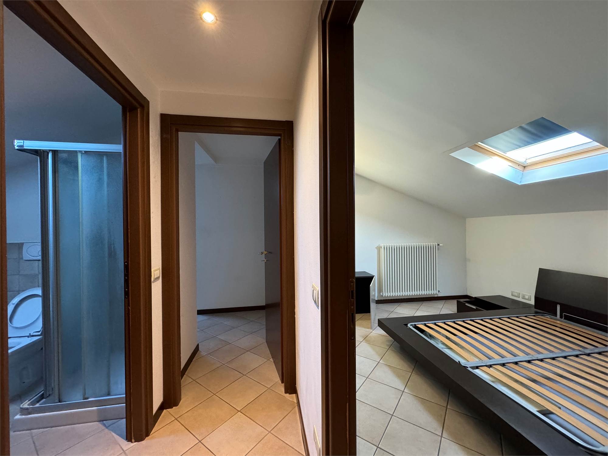 Salendo la scala in legno, si raggiunge il piano terzo: qui si sviluppa una seconda camera matrimoniale, illuminata da un Velux in legno e dotata di climatizzatore; un secondo bagno con doccia e Velux ed un locale studio, perfetto come spazio smart working o come eventuale stanzetta.