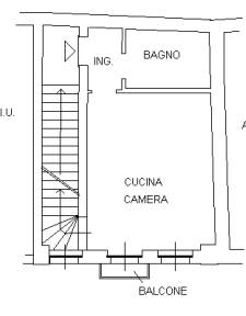 • L’ingresso dell’abitazione avviene dal piano terra su scala che ci conduce al piano primo; da qui entriamo su un comodo disimpegno che introduce al locale principale organizzato come ambiente open-space con cucina a vista. Sullo stesso livello è presente il bagno, cieco ma dotato di lucernaio interno che garantisce illuminazione naturale; l’ambiente è completo di vasca, attacco per lavatrice e sistema di ventilazione forzata. Dal soggiorno una scala interna conduce al livello superiore.