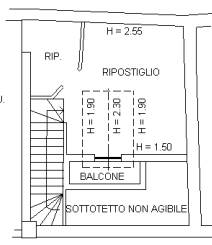 • L’abitazione si sviluppa su due livelli e presenta una distribuzione degli spazi particolare, con il locale abitativo principale usato come zona giorno al piano d’ingresso e locali accessori, ad oggi utilizzati come zona notte mansardata, al livello superiore. Gli ambienti risultano ben sfruttati e arricchiti dalla presenza di due balconi, uno collegato alla zona giorno e uno zona notte.